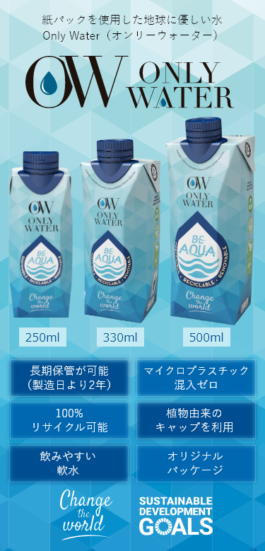 そこで Only Water は、持続可能な開発目標(SDGs)の達成に向けて、社会に貢献し地球環境の保全を図り紙パック飲料水の普及を目指しています。